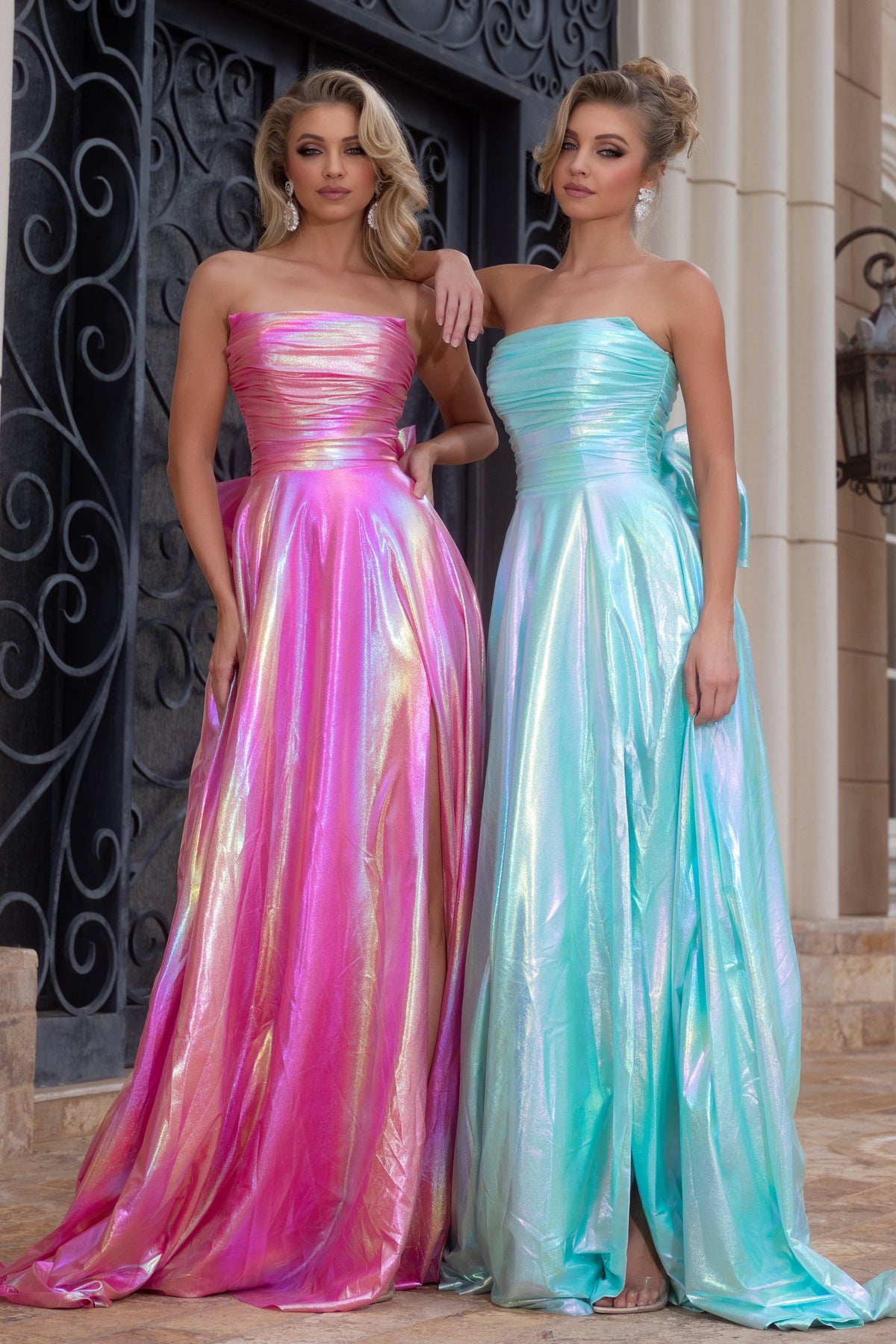 Discover the enchanting allure of the Portia and Scarlett PS25283 gown, a stunning strapless dress designed for unforgettable occasions. Featuring intricately crafted ruching on the bodice, this gown exudes elegance and texture while the straight-across neckline flatters the collarbone area. The mid-rise back is secured with a reliable zipper closure, and a charming bow accent adds a playful touch. With a daring high slit that tastefully reveals skin, the skirt gracefully transitions into an A-line silhouette, culminating in a dramatic sweeping train. Perfect for making a grand entrance at prom or any special event, the Portia and Scarlett PS25283 is a timeless choice that combines sophistication and style. Embrace the elegance and make your night memorable with this exquisite creation.