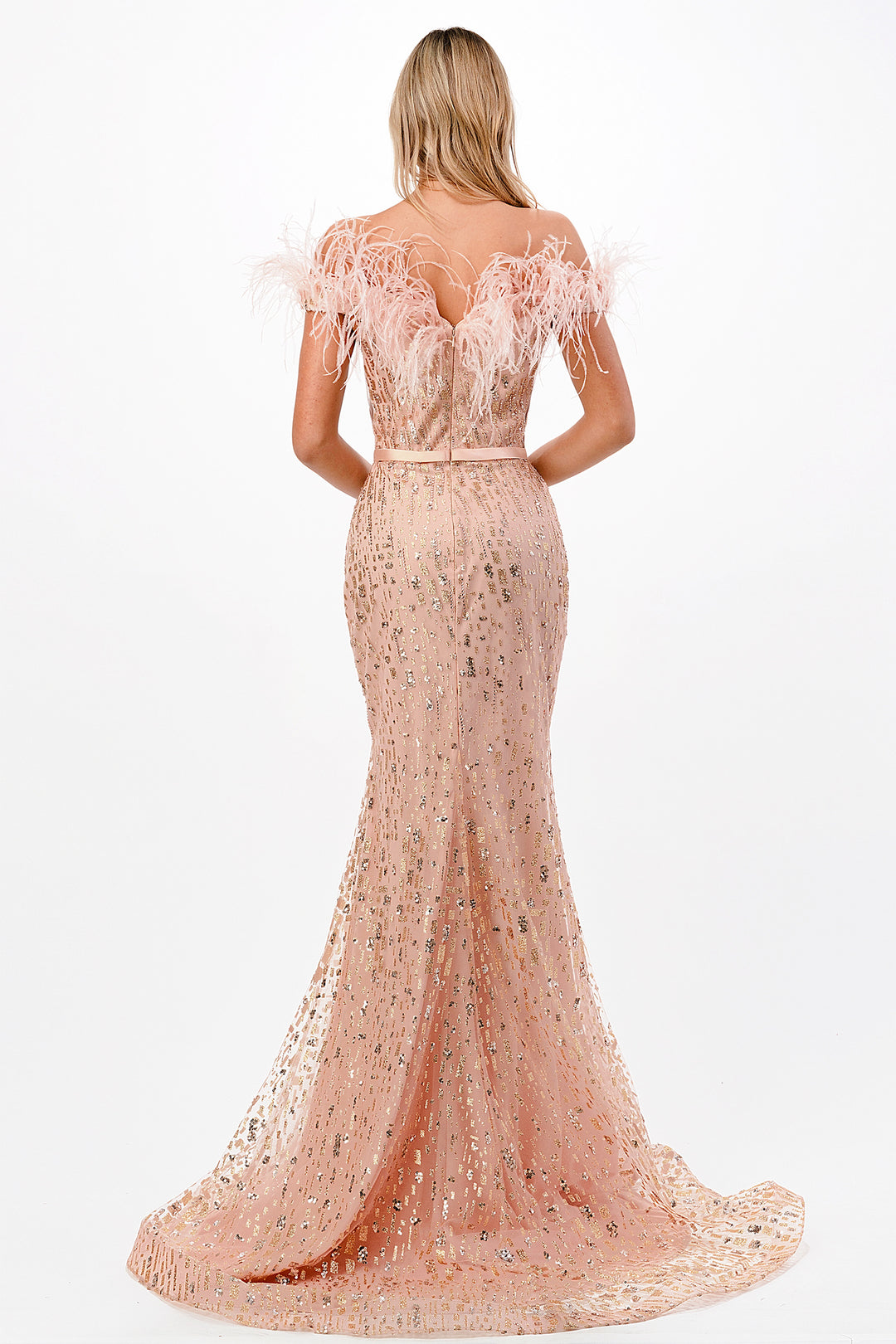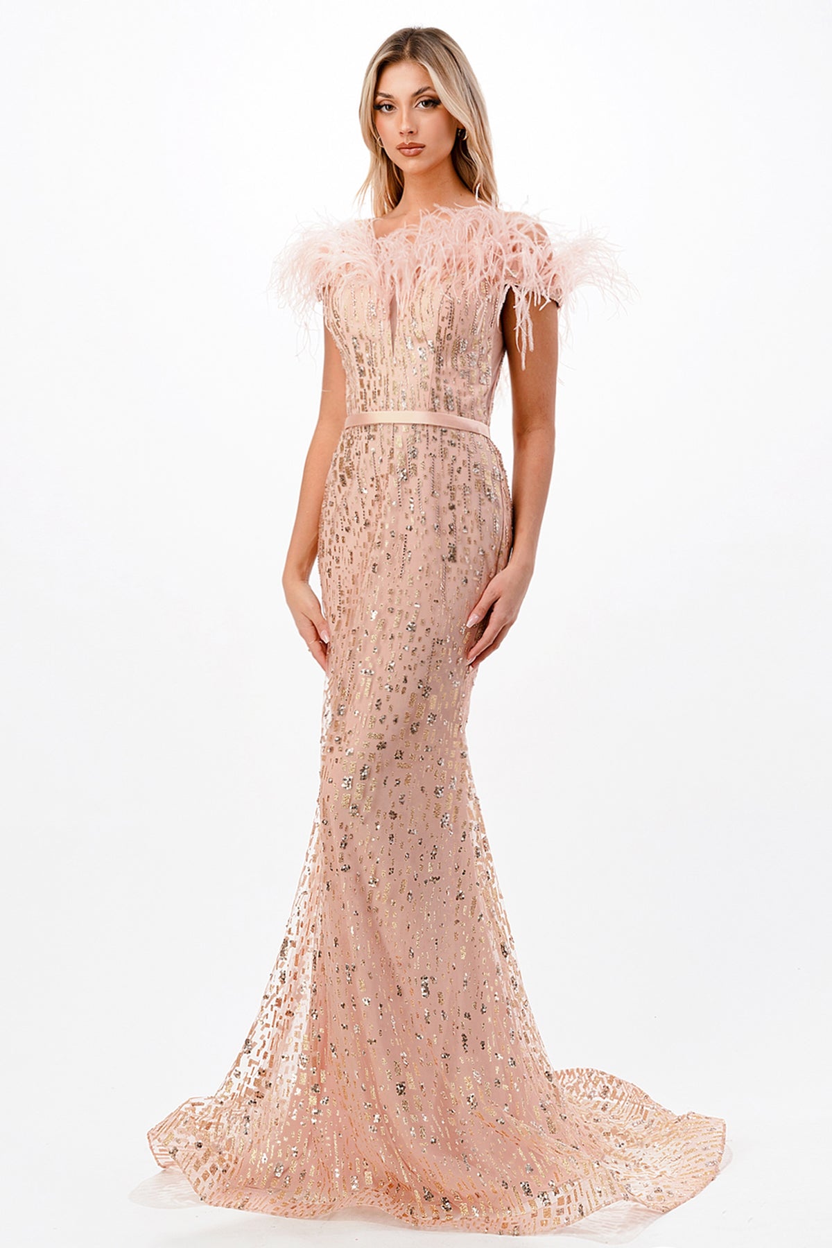 Be the showstopper of the soirée in the radiant Cinderella Divine CB082. Command the spotlight with an off-shoulder neckline embellished with exquisite feathers, setting the stage for your grand entrance. The allure of this masterpiece is heightened by the captivating glitter embellishment that gracefully cascades from the bodice to the enchanting mermaid silhouette, culminating in a mesmerizing sweep train. A satin belt cinches the waist, adding a touch of sophistication to this dazzling ensemble. Walk the red carpet with confidence and grace, leaving a trail of admiration in your wake.