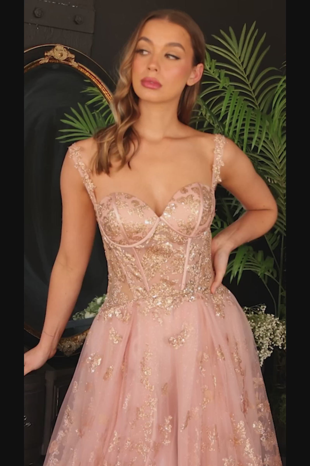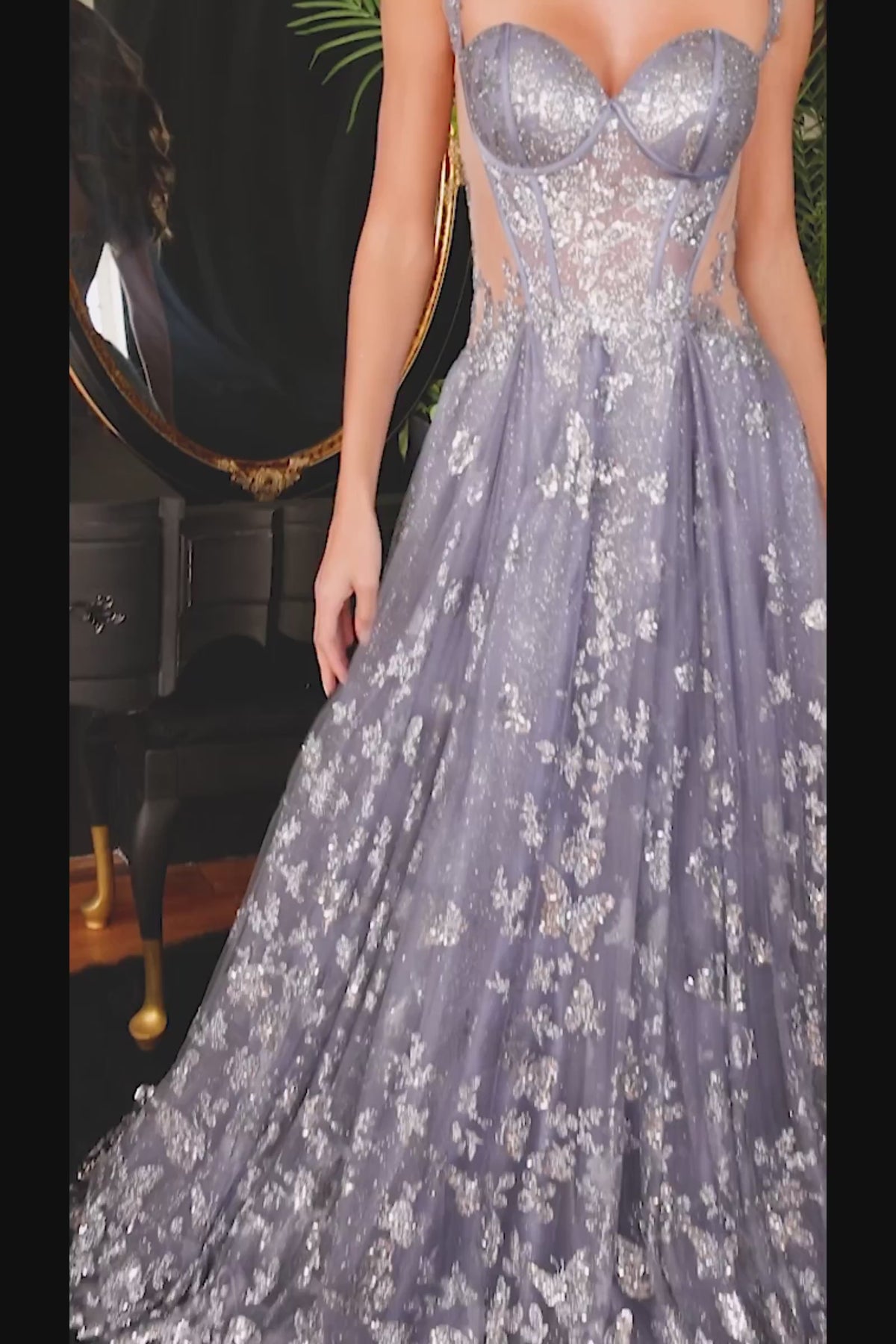 Embrace your exceptional style in the stunning Cinderella Divine CB102 creation. Adorned with shimmering metallic glitter print details, this dress captures attention at every turn. The sheer corset bodice boasts delicate spaghetti straps and a flattering sweetheart neckline. The sheer midrise back adds an alluring touch to the ensemble. The glitter embellished skirt features gossamer layers that twinkle with every step, elegantly flowing into a sweeping design. Step into the spotlight with confidence in this magnificent Cinderella Divine gown.