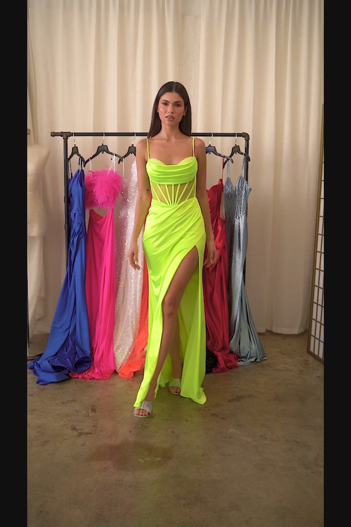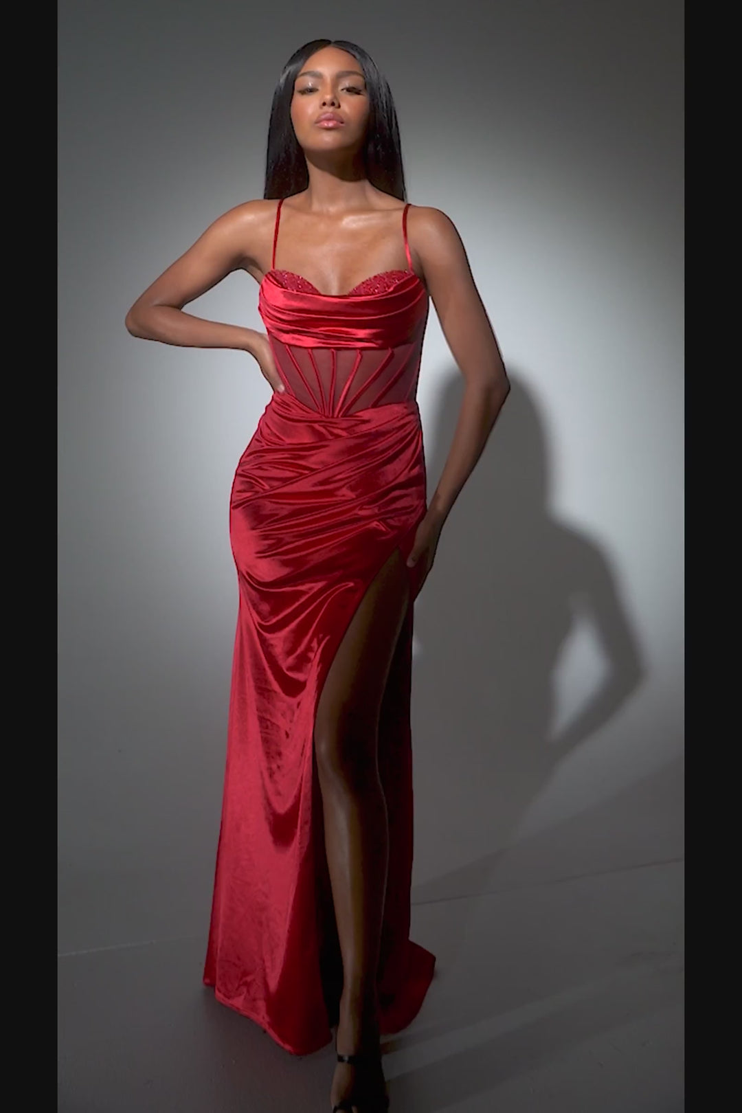 Elevate your presence and command attention in this striking Cinderella Divine CD265 creation. Impeccably structured with corset boning, the gown features a sheer bodice that exudes sensuality. The sweetheart neckline is suspended from delicate spaghetti straps, complemented by a graceful draping cowl detail. Adding an extra touch of allure, the sheer back boasts a lace-up design. The drape-ornate skirt is both dramatic and elegant, revealing a high slit that adds a hint of daring to the ensemble. As you step into the spotlight, this Cinderella Divine masterpiece ensures you radiate from every angle, capturing hearts and admiration.