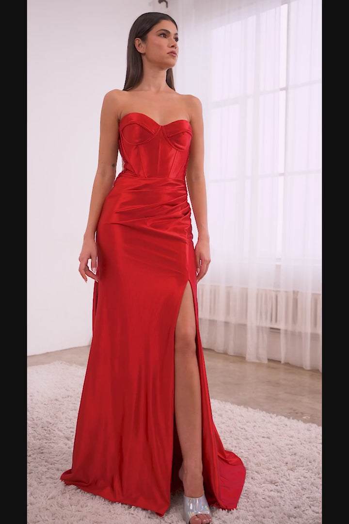 Elevate your style quotient with the exquisite Cinderella Divine CD273 gown. This strapless masterpiece is a testament to refined fashion, showcasing a corset bodice that emphasizes your figure with visible boning. The sweetheart neckline adds a touch of romance, while the mid-open back is secured by an adjustable lace-up tie for a customized fit. An illusion side adorned with beaded trim brings a touch of glitz and allure to the bodice. The gown's ruching and daring thigh-high leg slit combine to create an elegant and dynamic look. The skirt flows gracefully into a full-length sheath silhouette, culminating in a sweeping train that exudes a sense of luxury and glamour.