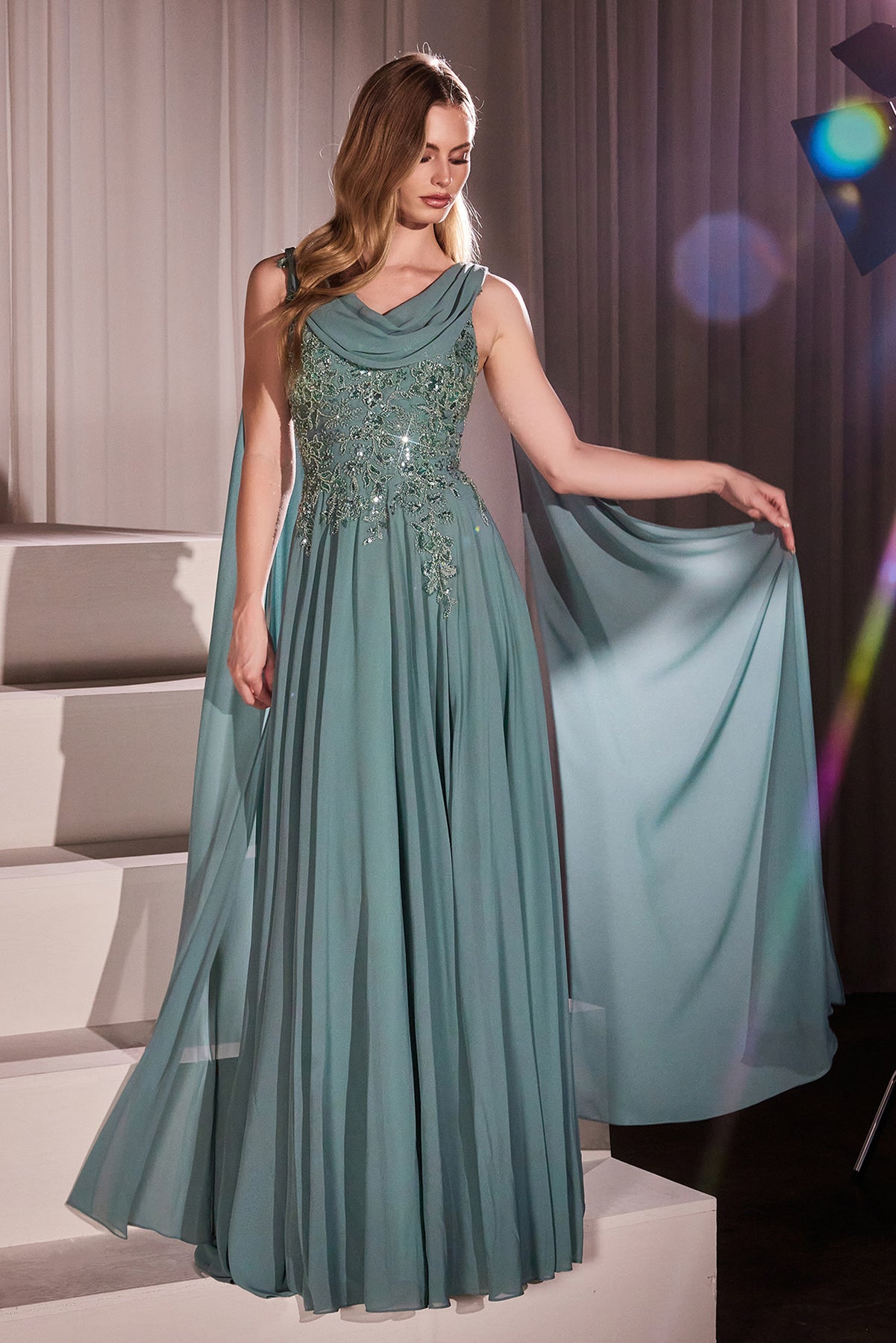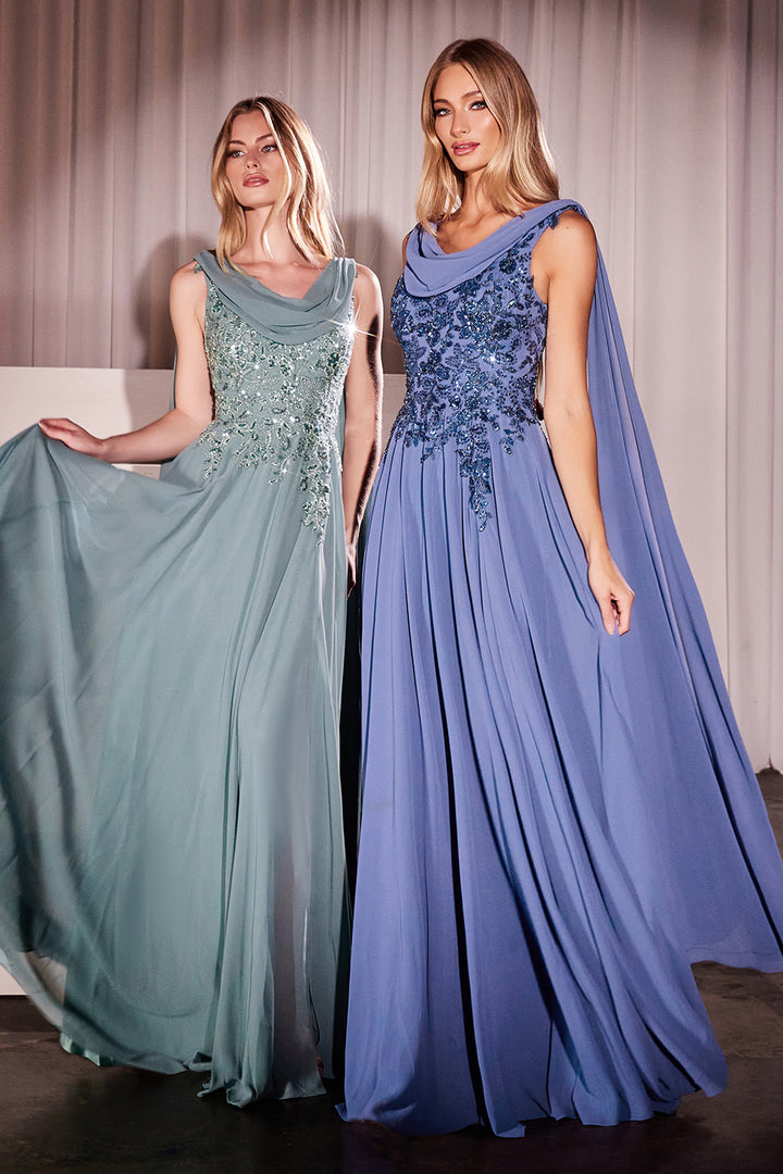 This A-line gown showcases a sophisticated scoop neckline, accented by a beautiful cowl back drape. The long chiffon sleeves cascade gracefully, resembling elegant sashes. The bodice is adorned with exquisite lace appliqués, harmonizing perfectly with the lightweight chiffon and flowing A-line skirt. Ideal for mothers of the bride or formal occasions, this dress provides a refined and modest appearance while remaining enchanting.