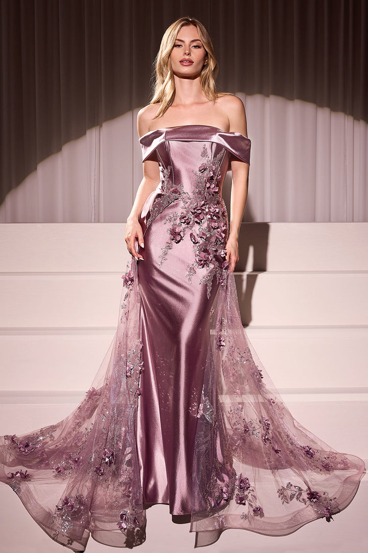 Capture everyone's attention in this exquisite fit-and-flare gown, showcasing a sophisticated off-the-shoulder neckline embellished with intricate floral details. Crafted from luxurious satin, this gown beautifully accentuates your silhouette, while the tulle appliquéd overskirt imparts a dreamy, graceful quality and fluidity. Ideal for formal occasions or as a stunning choice for the mother of the bride or groom, this dress effortlessly marries elegance with a romantic touch.