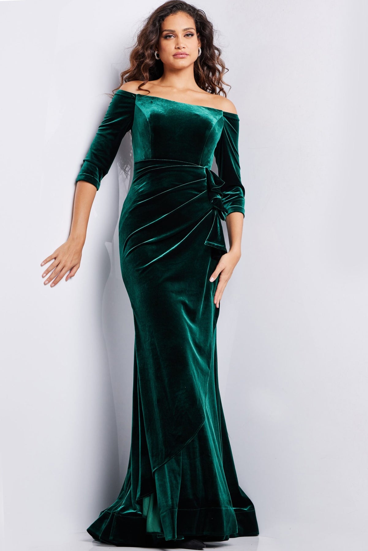 Make a statement at any evening event in this stunning Jovani 36458 dress. Designed in luxurious velvet, it features flattering ruched accents to enhance your shape. The off-shoulder neckline and quarter-length sleeves exude elegance, while the peek-a-boo back adds allure. A charming ruffled peplum adorns the waist, and the wrap-style skirt flows beautifully in a sheath silhouette to the floor. Turn heads in this red carpet-worthy gown by Jovani 36458, as seen in Emerald on the model.