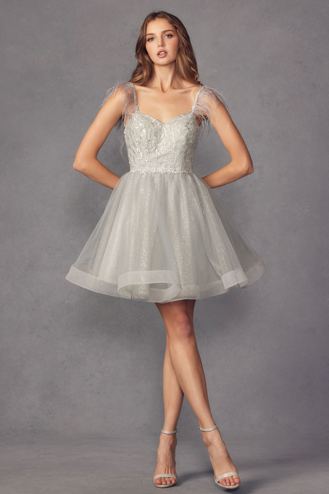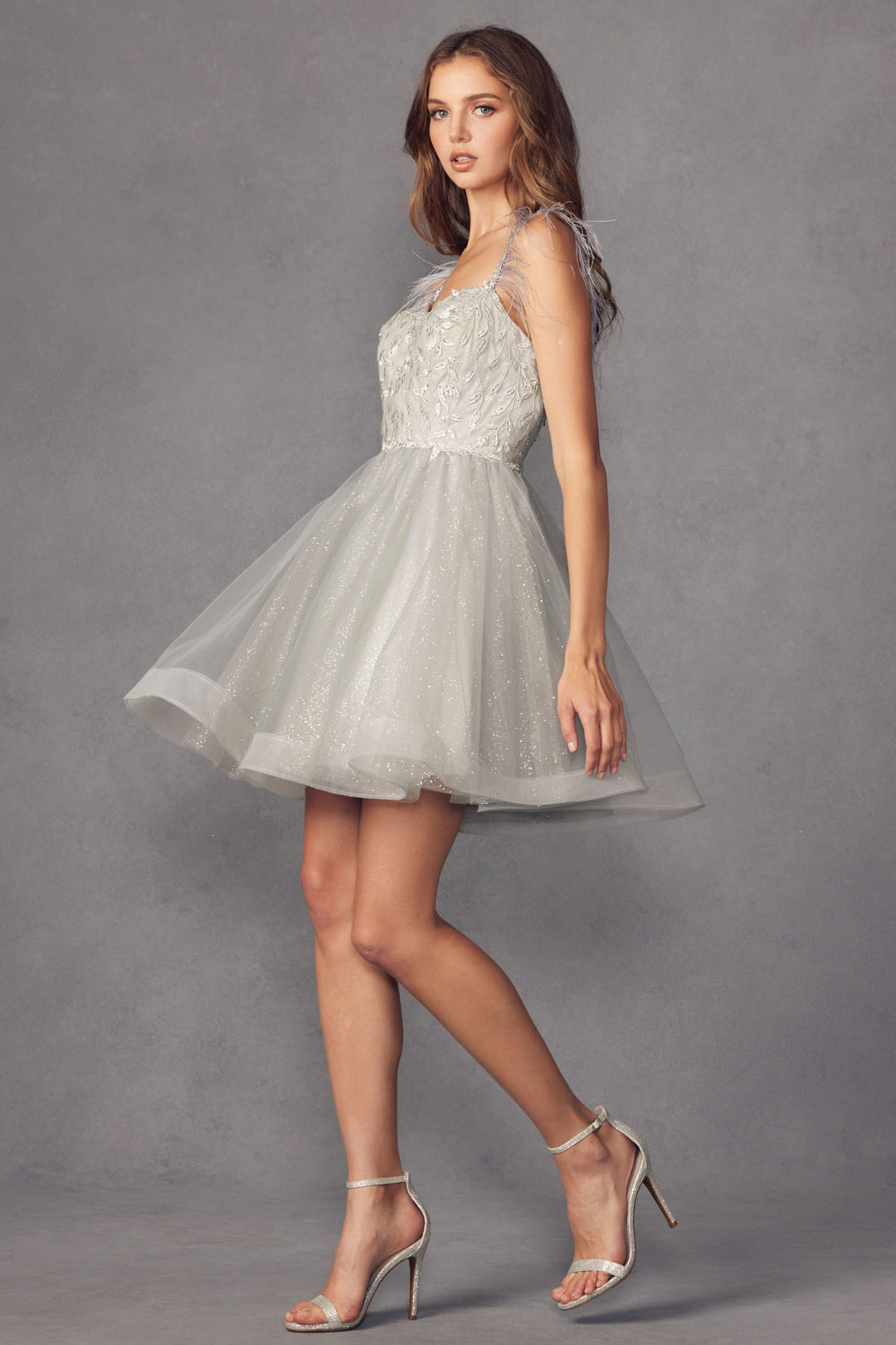 JULIET 881 Feather Straps Sheer Bodice Short Dress