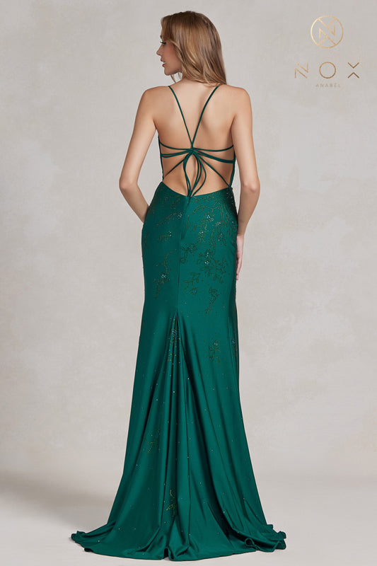NOX ANABEL E1206 Fitted Beaded Deep V-Neck Gown
