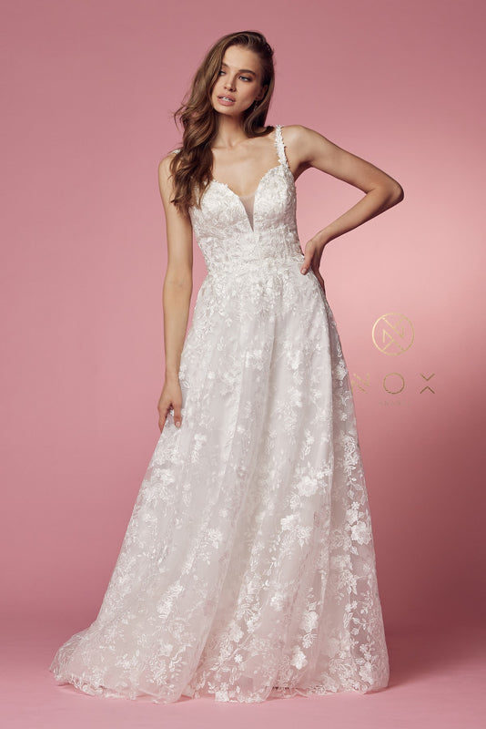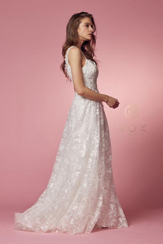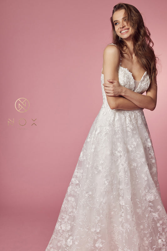 Transform into a captivating vision by donning this utterly mesmerizing Nox Anabel Bridal JE922 creation. Embellished with intricate floral embroidery that spans its entire length, this sleeveless gown boasts a plunging sweetheart neckline and an alluring open back, elegantly upheld by broad straps. The back is adorned with buttons and secured by a zipper closure. The skirt gracefully forms a full-length A-line silhouette, culminating in a delicate sweep train that adds a touch of grace to your every move. With its remarkable charm, this Nox Anabel Bridal masterpiece is a testament to unparalleled beauty.