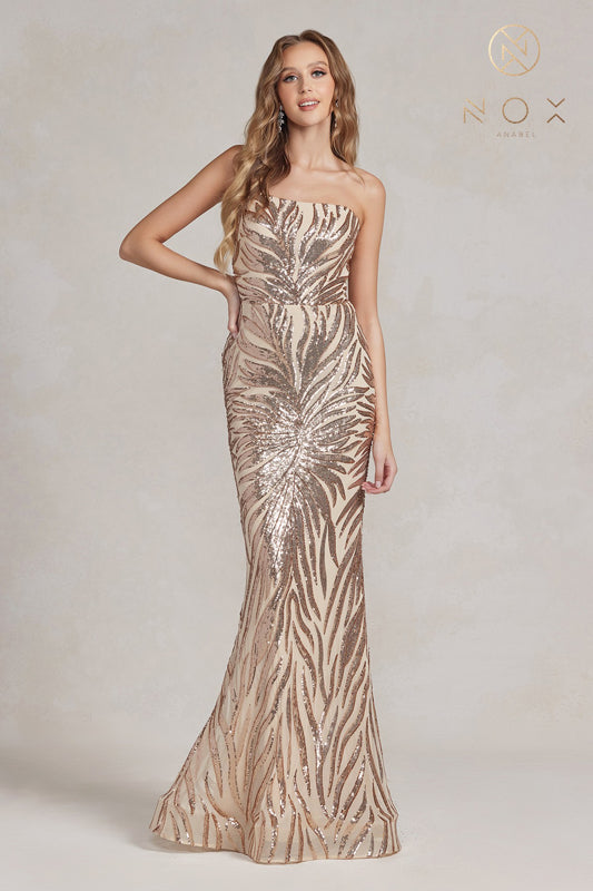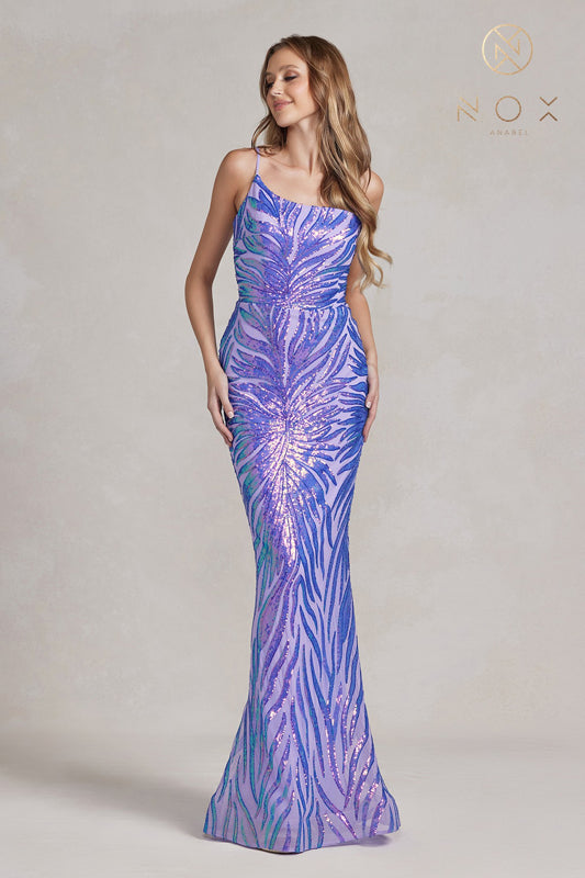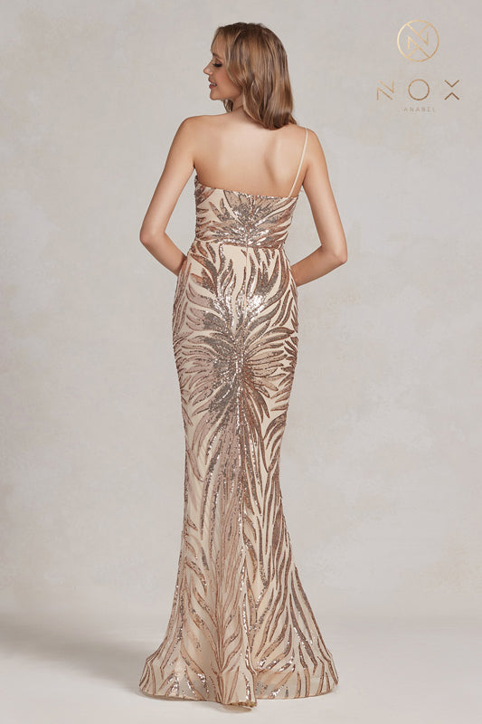 Entrance the entire ballroom as you glide gracefully in the enchanting Nox Anabel R1204 masterpiece. Embellished with a captivating trailing foliage pattern of sequins on a figure-enhancing form, this gown showcases an asymmetrical neckline adorned with a delicate spaghetti strap. Elegantly crafted with a midrise accent and a secure zipper closure, this ensemble achieves its allure with an embellished skirt that boasts a shimmering train, seamlessly embodying a captivating mermaid silhouette. Command the spotlight in this mesmerizing Nox Anabel creation, leaving an indelible impression on all who behold your presence.