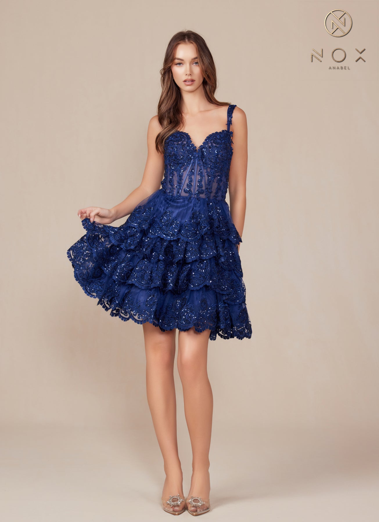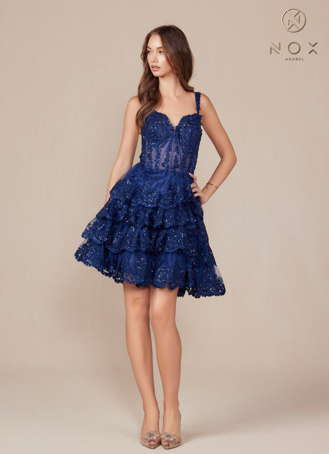 Elevate your style with the Nox Anabel R880 dress, a captivating sleeveless design adorned with shimmering embroidered sequin appliqué. This exquisite dress features a flattering A-line silhouette and a tiered skirt that gracefully flows with every step, offering both elegance and a touch of playful sophistication. Perfect for special occasions, its intricate detailing and luxurious sparkle ensure you'll make a memorable impression.