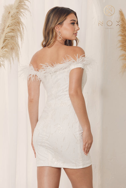 NOX ANABEL T790 Feathered Off Shoulder Glitter Print Short Cocktail Dress