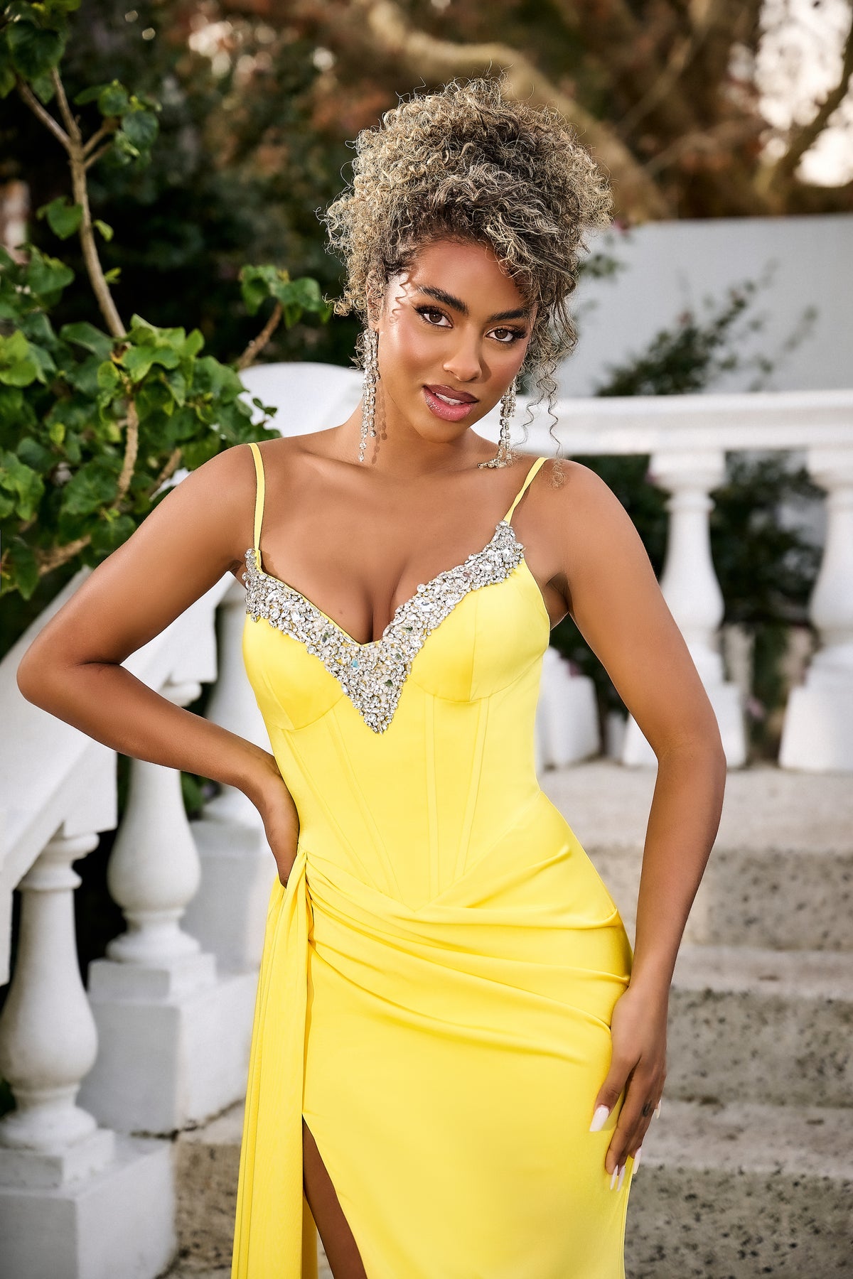 Prepare to fall head over heels in love with the elegance of this dress inspired by Portia and Scarlett PS23188. Trimmed with iridescent jewels and featuring a corset-boned bodice, this stunner boasts a sweetheart neckline and a basque waist. The dress is adorned with draping and a seductive thigh-high slit. The trumpet skirt is accompanied by a cascading sash, creating a figure-flattering and simply stunning look. This design is available in Red, Blue, Cobalt, Pink, Yellow, Lilac, and Black.